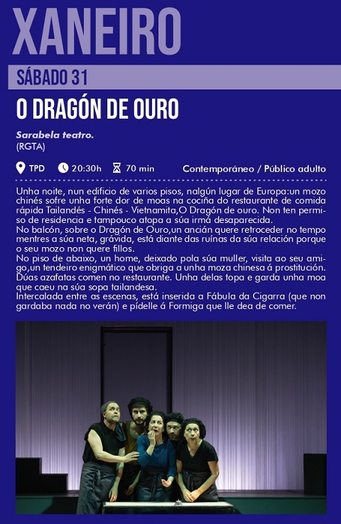 A compañía Sarabela Teatro representará a obra titulada O dragón de ouro en Viveiro este sábado, día 31 de xaneiro. Será ás 20:30 horas no Teatro Pastor Díaz.