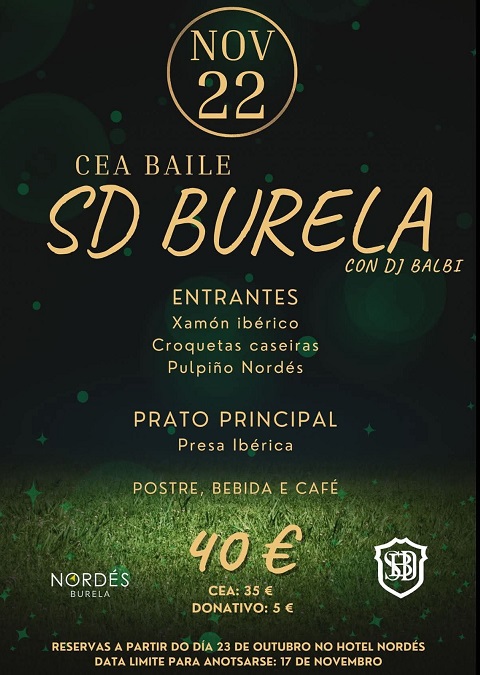 O club Sociedade Deportiva Burela celebrará unha cea baile este sábado, día 22 de novembro, no Hotel Nordés. A música correrá a cargo de DJ Balbi.