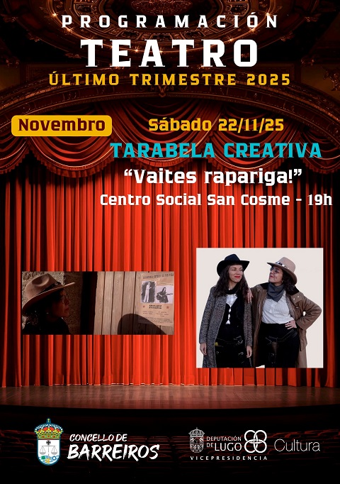 A compañía teatral Tarabela Creativa representará obra Vaites rapariga! este sábado, día 22 de novembro, ás 19:00 horas no Centro Sociocultural de San Cosme de Barreiros. A entrada é de balde.