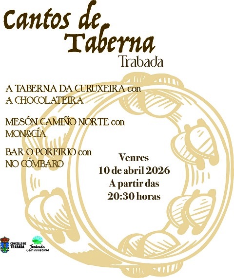 O Concello de Trabada organiza unha nova edición dos Cantos de Taberna, unha proposta cultural que terá lugar o venres 10 de abril a partir das 20:30 horas e que levará a música tradicional a diferentes establecementos hostaleiros do municipio.