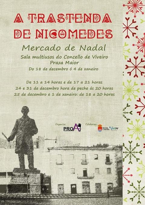 O Concello de Viveiro informa da apertura do mercado de Nadal “A Trastenda de Nicomedes” este sábado, 18 de decembro, ás 11:00 horas . O mercado ubícase no Salón Multiusos da Casa do Concello e está organizado pola Asociación Proa, en colaboración co Concello de Viveiro no marco do seu programa de Nadal.