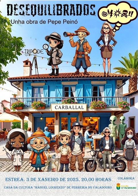 “Os de Trípode levamos varios meses traballando intensamente na nosa nova obra, titulada Desequilibrados. Por fin, o vindeiro 3 de xaneiro de 2026, co novo ano xa andando, estrearémola en Ferreira do Valadouro, ás 20,00 horas. Antes de nada, debemos mostrar o noso sincero agradecemento ao concello do Valadouro e á súa área de Cultura por todas as axudas e facilidades que nos deron para levar adiante os ensaios e, finalmente, a estrea; a Juan Novás, técnico de cultura do Valadouro, polo seu xeneroso traballo, que nos beneficia a todos; a Suso Rubio, tamén técnico de cultura do Valadouro, por regalarnos a súa creatividade en forma deste cartel, unha auténtica marabilla. Nunha fantasía espacial, queremos facer un canto de louvanza á diferenza, á riqueza que supón que cada un sexamos á nosa maneira. Queremos destacar os perigos que contén a igualación, a masificación, o feito de que nos convertamos en fotocopias iguais dunha idea dirixida por outros. Por iso, aínda que Desequilibrados, como sempre, é unha comedia, non deixa de ter unha mensaxe final profunda”, anuncia o grupo Trípode.