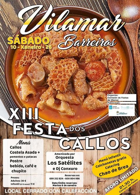 A comisión de festas de Vilamar, no municipio de Barreiros, celebrará a súa XIII Festa dos Callos este sábado, día 10 de xaneiro. Será nun local cerrado con calefacción no campo da festa ás 21:30 horas.