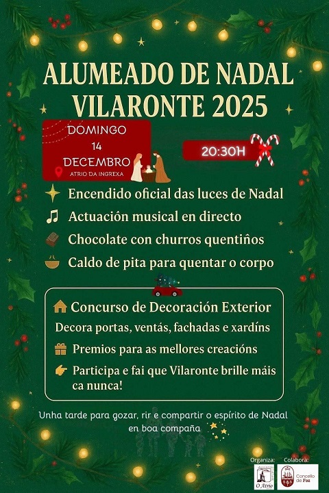 A asociación O Atrio tamén dá a coñecer que “xa está en marcha o concurso de decoración exterior Vilaronte énchese de luz!. Este Nadal queremos que Vilaronte brille coma nunca: a asociación O Atrio de Vilaronte propón unha nova actividade para acompañar o noso tradicional acendido das luces de Nadal, un concurso de decoración de casas, fachadas e xardíns. Cada veciño/a ou familia pode decorar o exterior da súa casa, balcón ou xardín con luces e motivos de Nadal. Para participar anótate a través de calquera membro da comisión ou por calquera das redes sociais da asociación, indicando o teu nome e a casa. Terás ata o día 24 de decembro para ter a túa decoración lista. Faremos un pequeno mapa coas casas participantes para que todos poidamos pasear e gozar das marabillas de decoracións. O xurado da comisión visitará as casas decoradas nos días seguintes ao acendido. Haberá dous premios para as decoracións máis fermosas e orixinais. O nome da casa gañadora anunciarase o día 28 de decembro”.