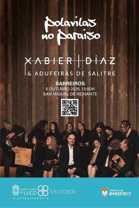 Xabier Díaz e Adufeiras de Salitre actuarán este domingo, día 5 de outubro, en San Miguel de Reinante (Barreiros) dentro do ciclo Polavilas no paraíso, promovido pola Vicepresidencia da Deputación de Lugo.