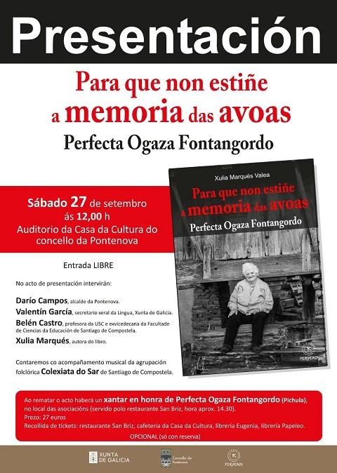 A escritora Xulia Marqués Valea presenta na Pontenova o seu libro titulado Para que non estiñe a memoria das avoas. Perfecta Ogaza Fontangordo. Será este sábado, día 27 de setembro, ás 12:00 horas no Auditorio da Casa da Cultura do Concello da Pontenova. Con entrada libre.