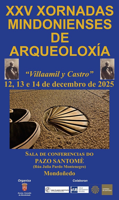 “Mondoñedo retoma a actividade divulgativa coa habitual cita arqueolóxica de decembro que, na presente edición, acada os 25 anos. A cita, que combina charlas e visitas, terá lugar os días 12, 13 e 14 de decembro na Sala de Conferencias do Pazo Santomé, na rúa Julia Pardo Montenegro, e será unha edición que versará, de forma xenérica, sobre o Fenómeno Xacobeo, abordando aspectos arqueolóxicos, históricos e da historia da arte, combinando isto cunha visita guiada ao Pórtico da Gloria e á Necrópole da Catedral de Santiago”, anuncia o Concello de Mondoñedo, que nesta edición conta coa colaboración Vrije Universiteit Brussel (VUB) (Bruxelas, Bélxica), o Max Planck Insitute of Geoanthropology (Jena, Alemaña) e a Catedral de Santiago “para levar adiante unha presentación e revisión ao respecto da temática proposta”.