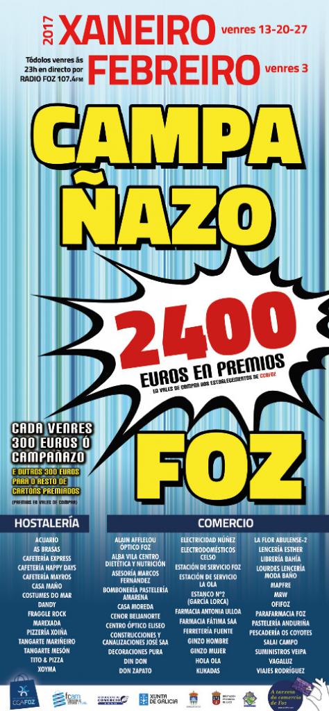 O día 13 deste mes comeza unha nova edición do Campañazo, que organiza o Centro Comercial Aberto de Foz. Desenvolverase todos os venres ata o 3 de febreiro e repartiranse un total de 2.400 euros en premios, que consisten en vales de compra para gastar nos establecementos asociados ao CCA focense.