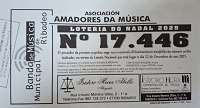 La asociación Amadores da Música, de Ribadeo, obsequia a sus socios y socias al corriente de pago de la cuota de este año 2025 con una participación de 50 céntimos de euro de Lotería Nacional del número 17.446 para el sorteo extraordinario de Navidad, que se celebrará el día 22 de diciembre, lunes.