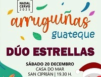 “Este Nadal teremos tamén Guateque de Arruguiñas. O vindeiro sábado convidámosvos a desfrutar dunha tarde noite chea de música, baile e bo ambiente co dúo Estrellas. Un plan perfecto para desfrutar, reencontrarse e celebrar xuntos estas datas tan especiais”, anuncia o Concello de Cervo.