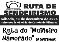 A Asociación de Sendeirismo Terras de Lourenzá organiza un percorrido pola Ruta do Muiñeiro Namorado, no municipio da Pontenova para este sábado, día 13 de decembro. A distancia a percorrer son 9 quilómetros e a dificultade é baixa. Ao rematar a camiñada os participantes xantarán no restaurante O Lar de Balbina.