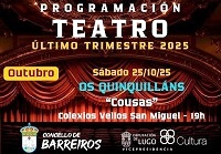 Este sábado, día 25 de outubro, ás 19:00 horas os colexios vellos de San Miguel, no municipio de Barreiros, acollerán a representación da obra Cousas, a cargo da compañía Os Quinquilláns. Con entrada de balde ata completar aforo.